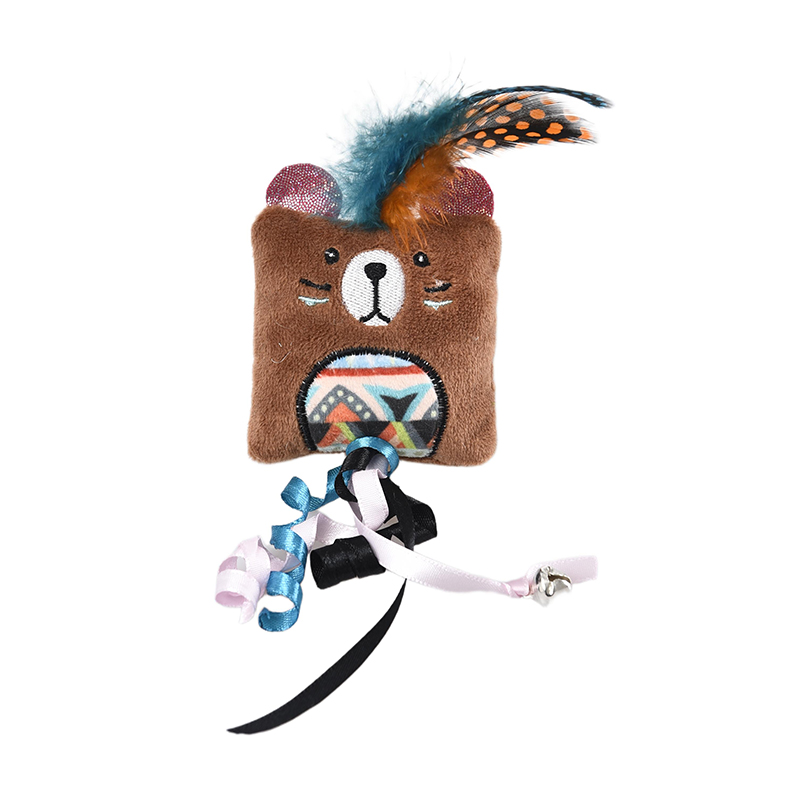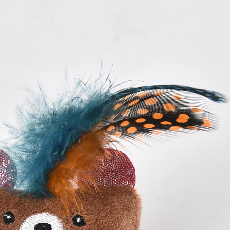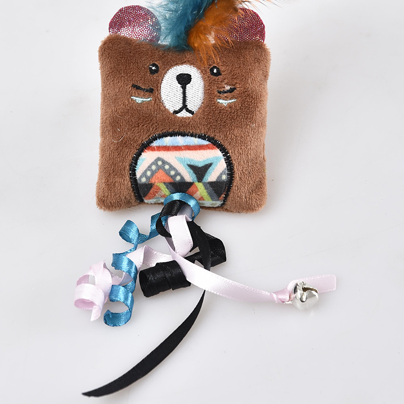 Игрушки имеют яркие формы животных, украшение из перьев на верхушке и ленту с колокольчиком внизу, чтобы привлечь внимание кошек.